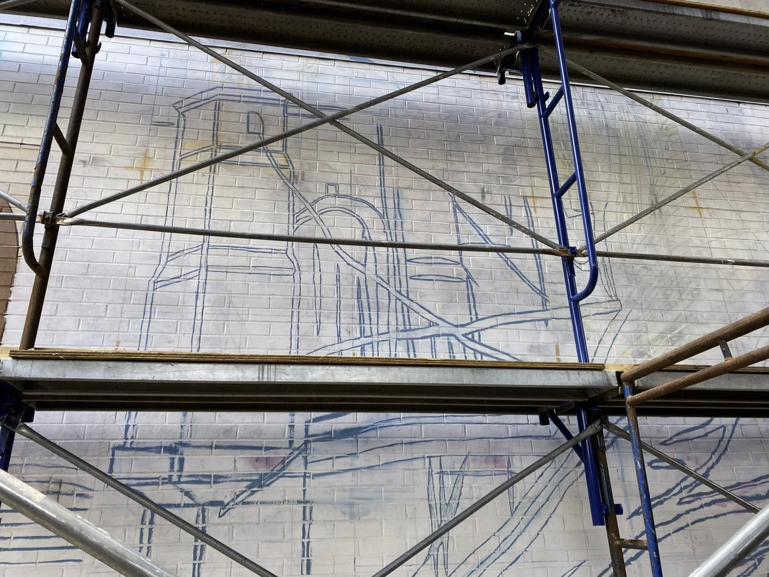 We began the mural by gridding the wall with rulers into equal squares. We had printouts with the mural divided into squares organized by numbers and alphabetical rows. We hand-drew them onto the wall with chalk and contractor crayon.