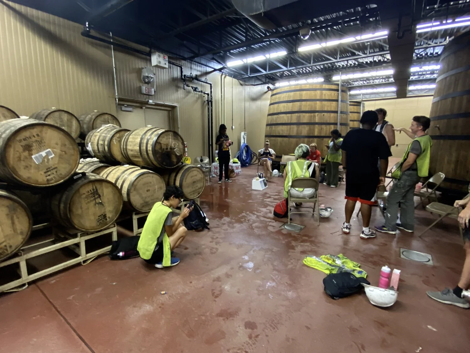 When it rained and we couldn’t work, we were given the Sam Adams fermenting beer room. It’s a cool room! It also made me gag more than a few times. If you stay in there past ten minutes or so, you get a headache. Don’t breathe in too hard or you will be gagging. Eventually, we all got used to it. Mostly. Those of us with cars were allowed to wait in there while the rain passed.