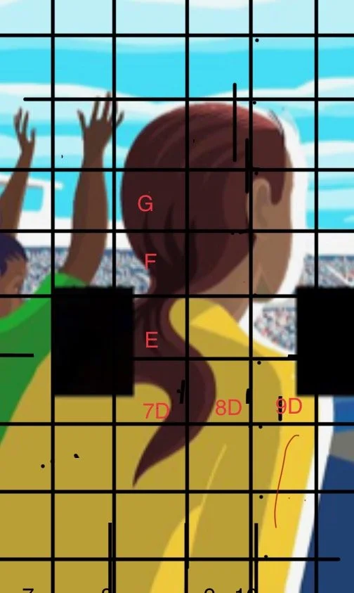 I corrected and drew the woman's hand in the green shirt. This was interesting as we decided to draw them with more structure than what was shown in the design. We also edited her forearms a teensy bit to have more structure like the faces. It could have been an issue with the file, but when blown up, they became swollen and uneven in thickness. Therefore, we were granted permission to give them more structure.