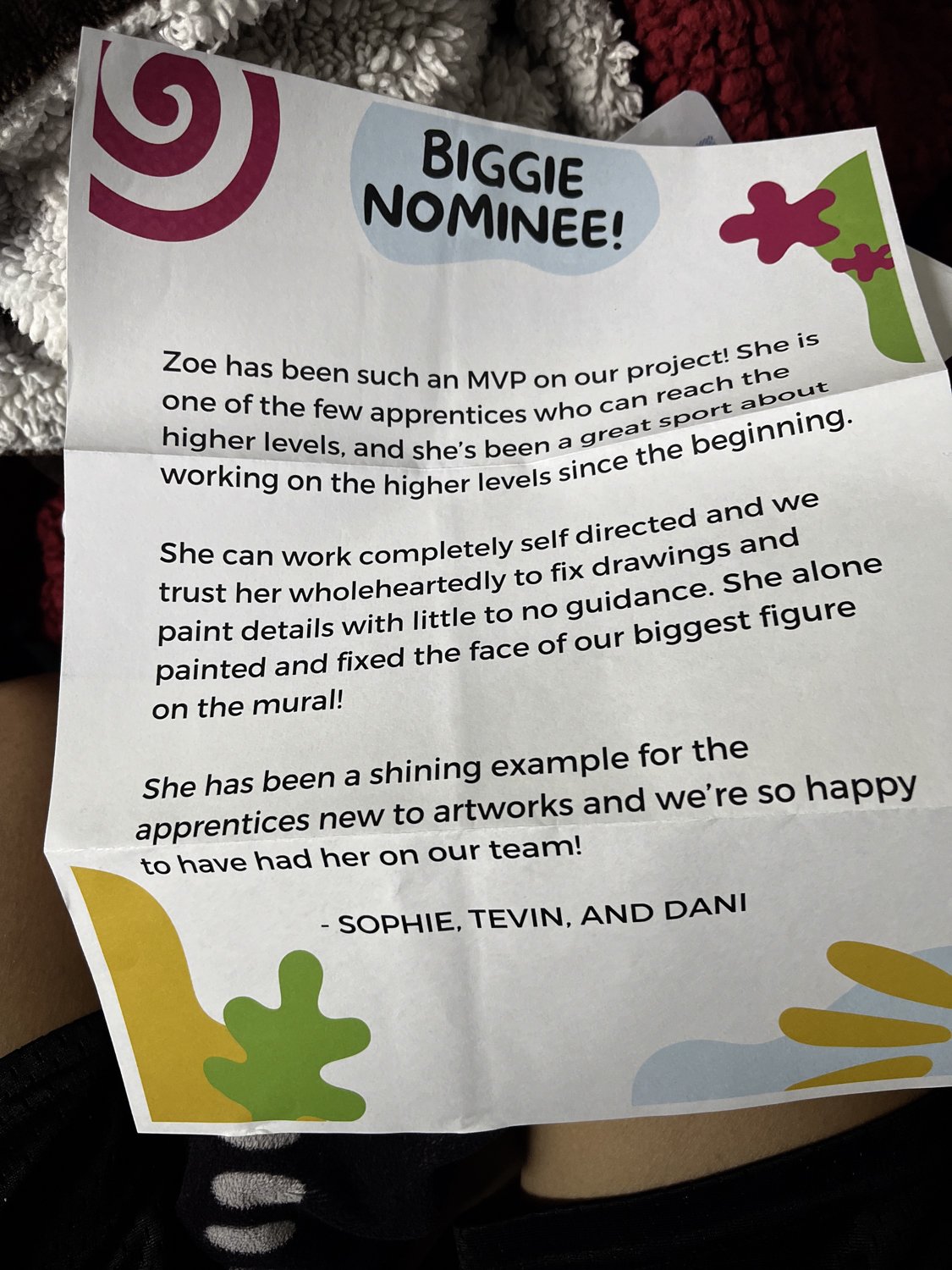 I was also nominated for the Biggie Award. Each mural team selects a team member to be up for the award based on work and teamwork. I was very gratefully chosen for our team's nomination!