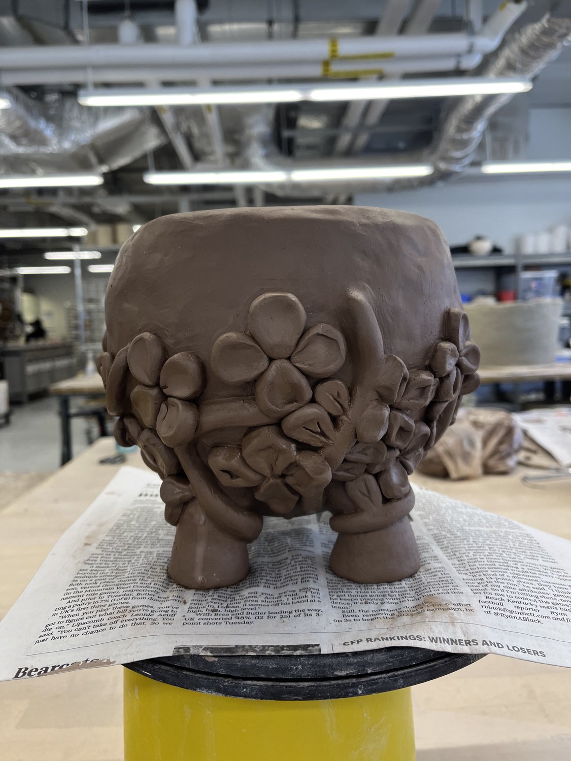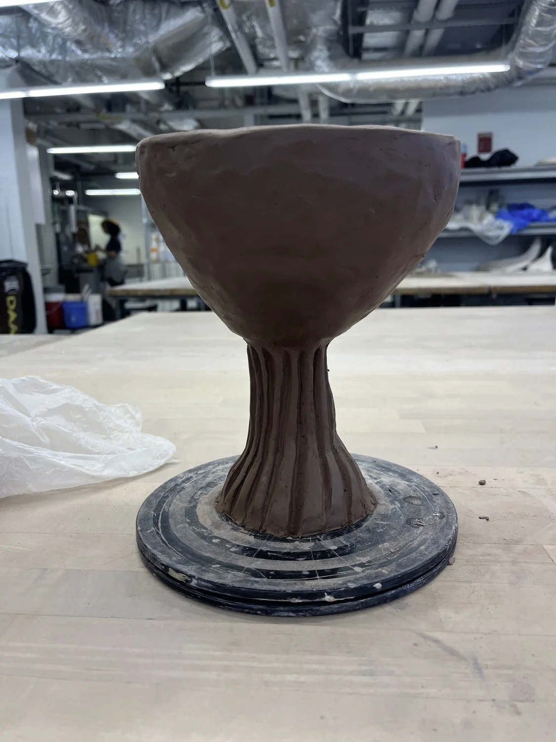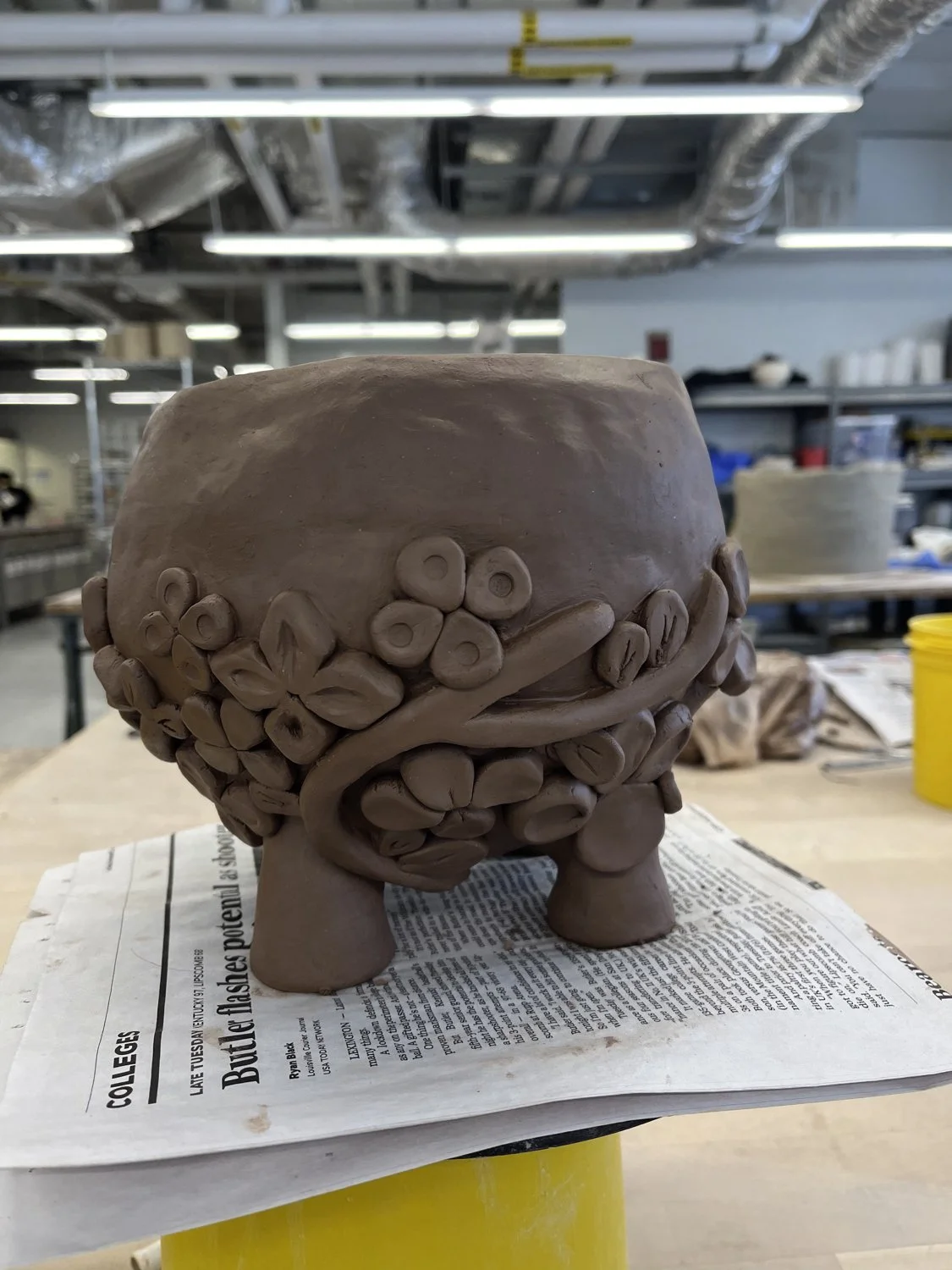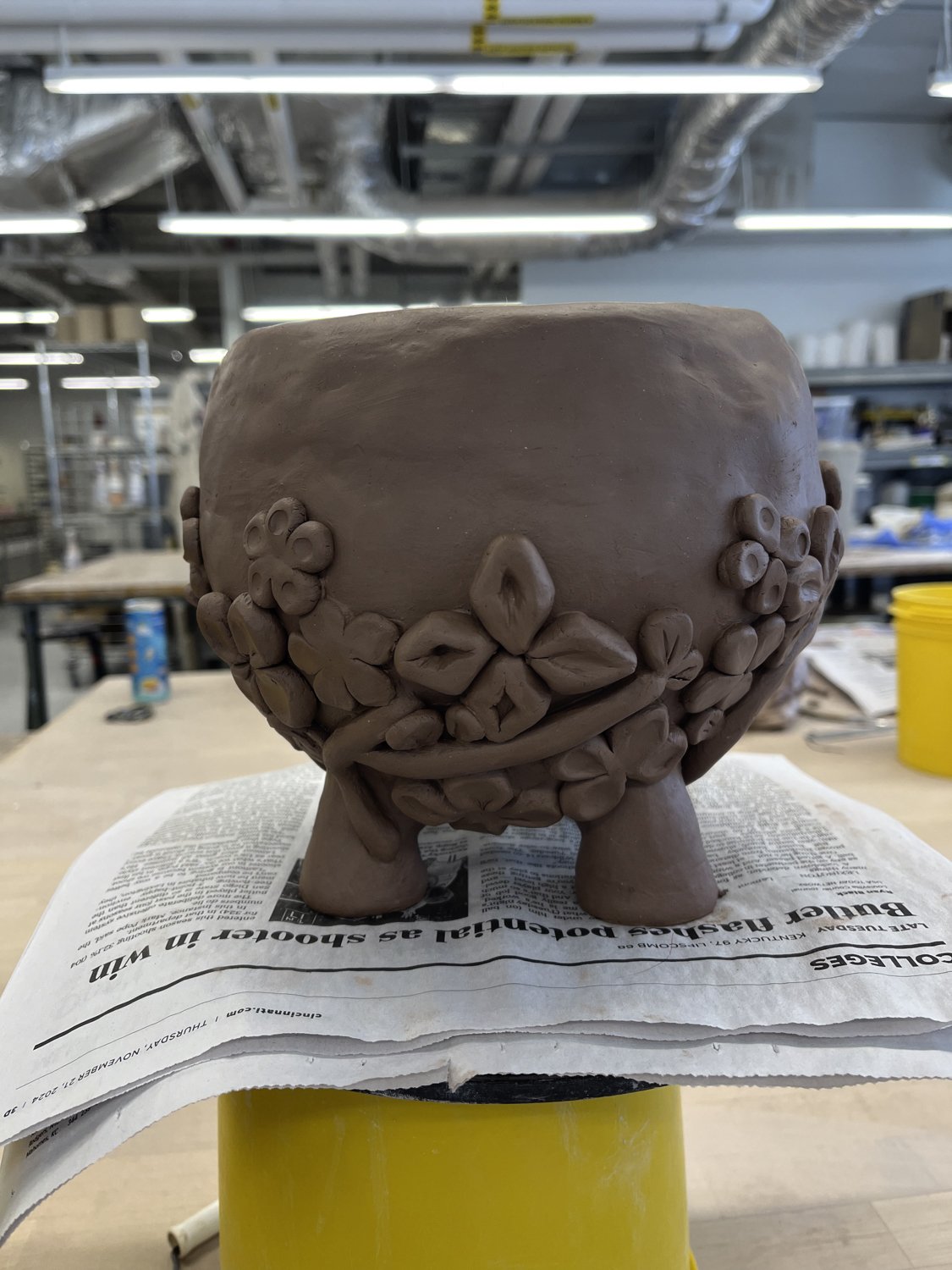 This piece was inspired by historical clay pieces reimagined to make something new. I was inspired by tripods, vases, and the Rococo period. T