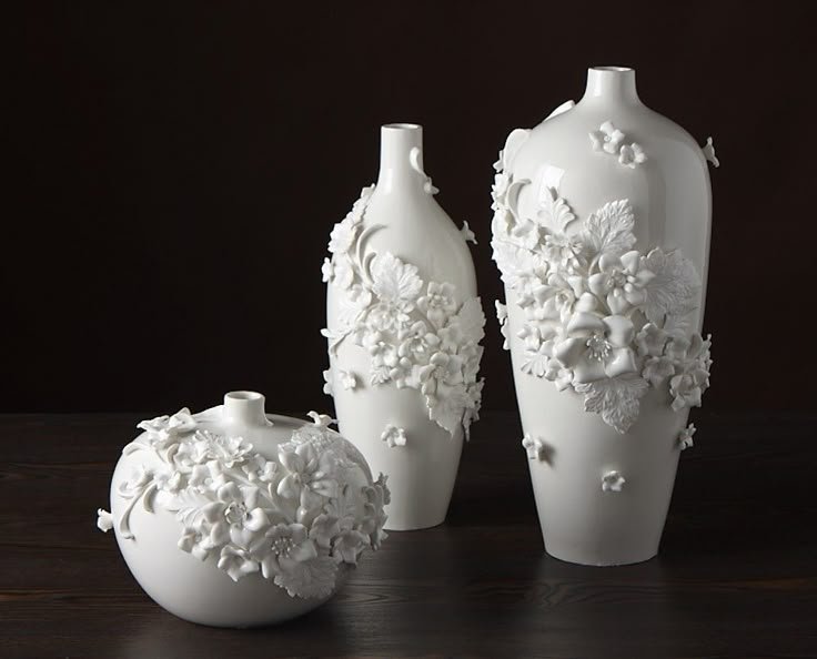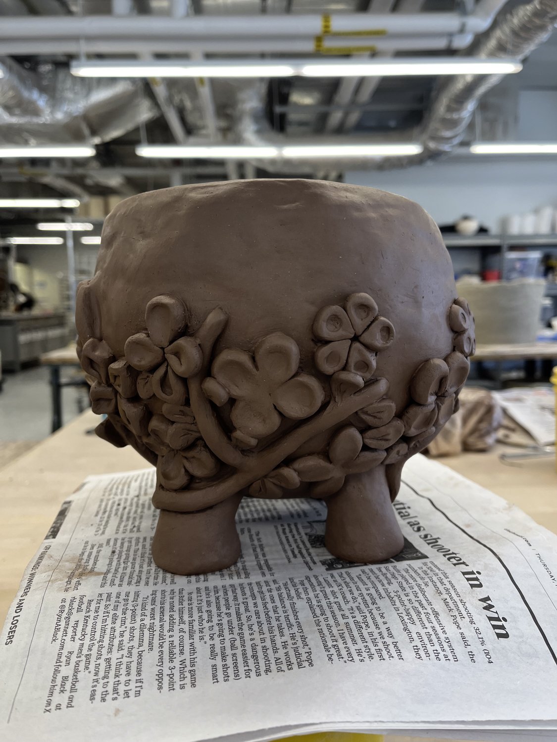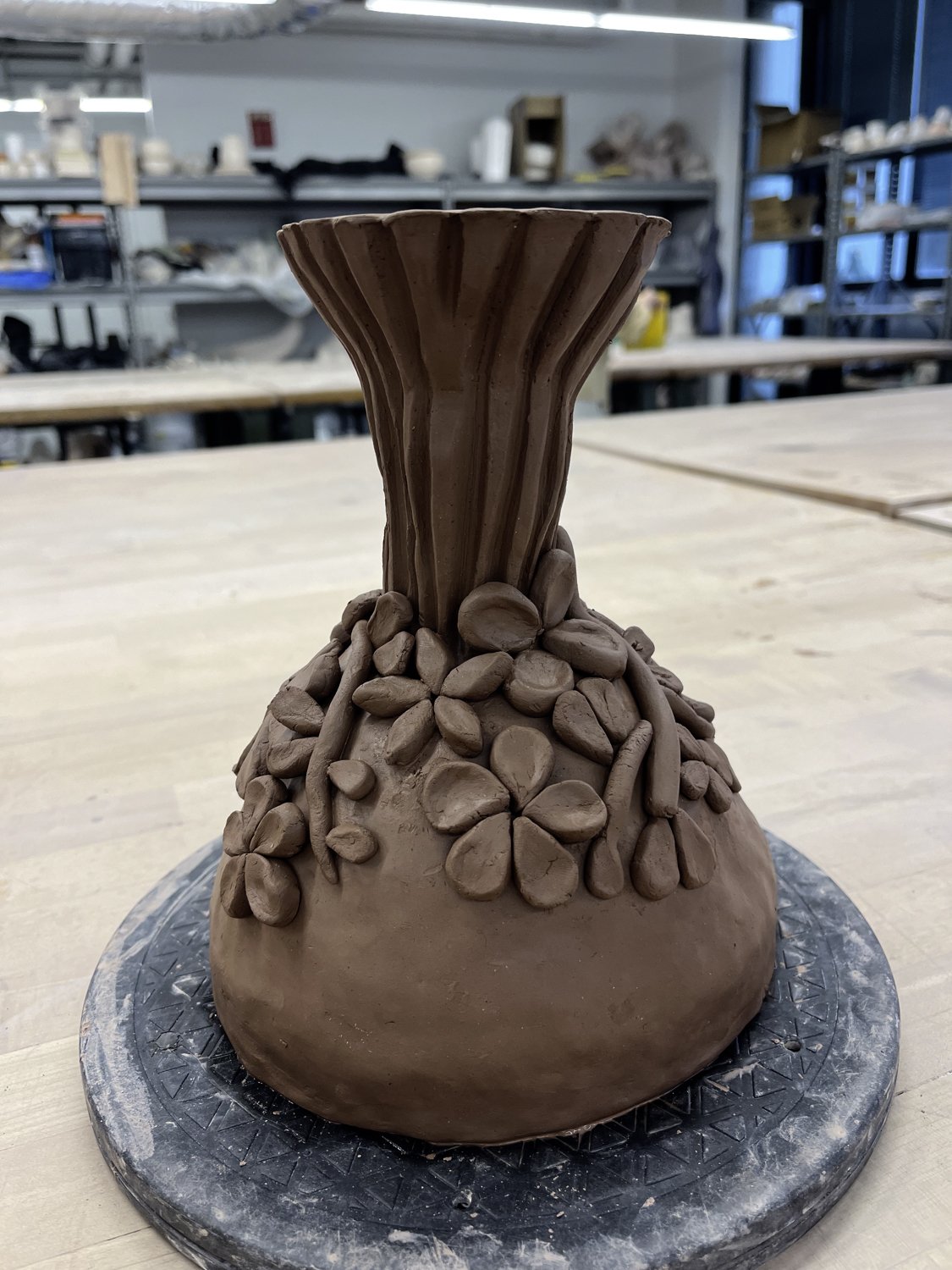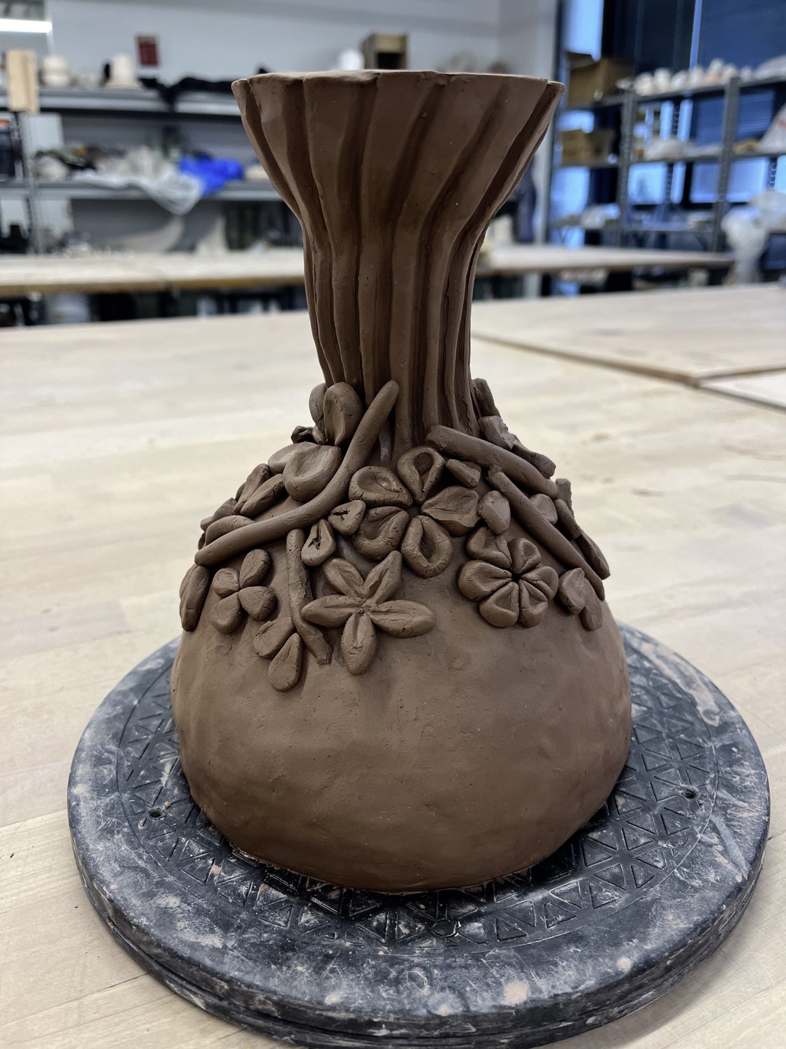 I added flowers and stems by rolling logs and spheres of clay. Then pressing and scoring and slipping the details on. This was fun for about ten minutes—but I love how it came out!