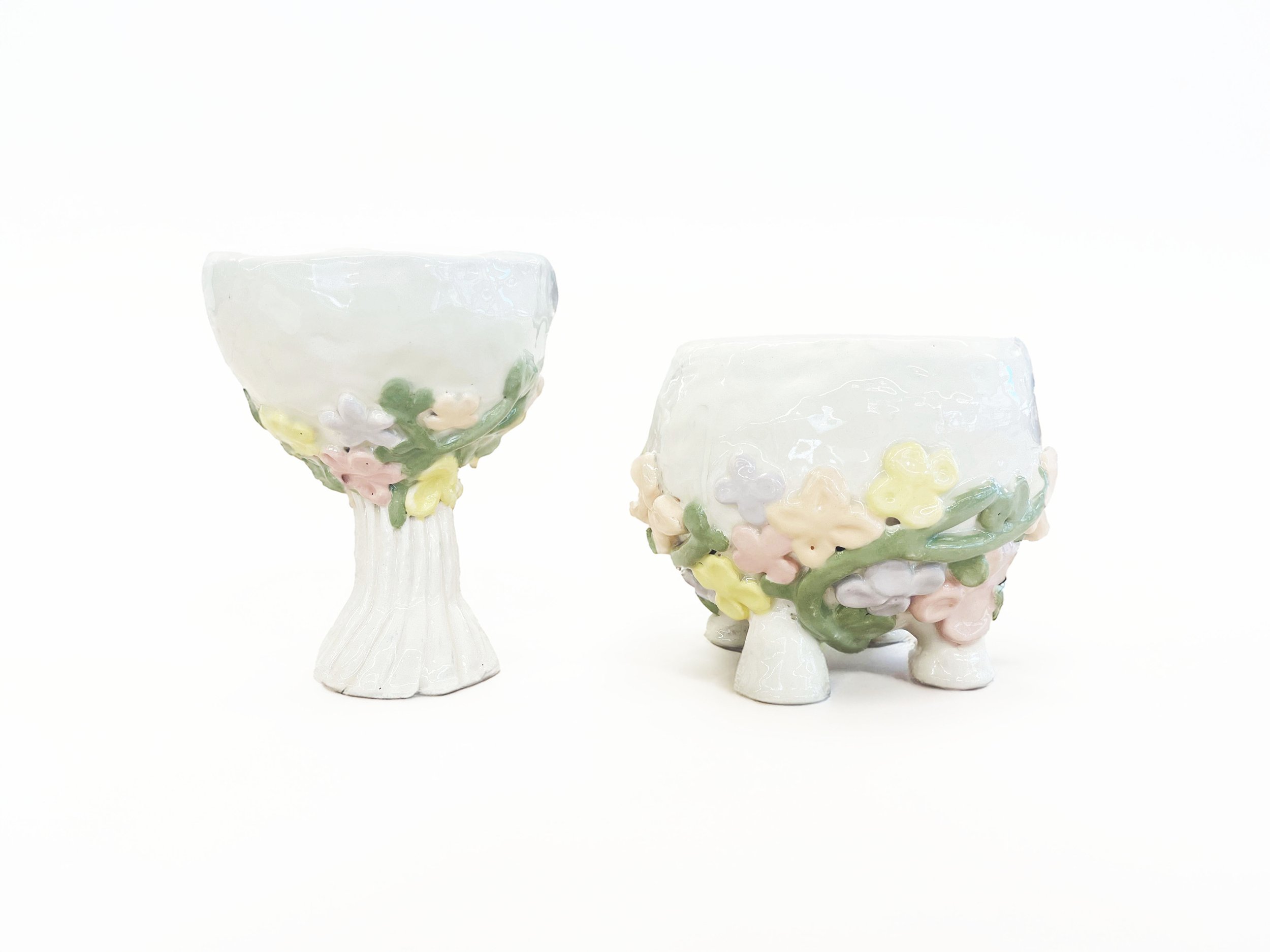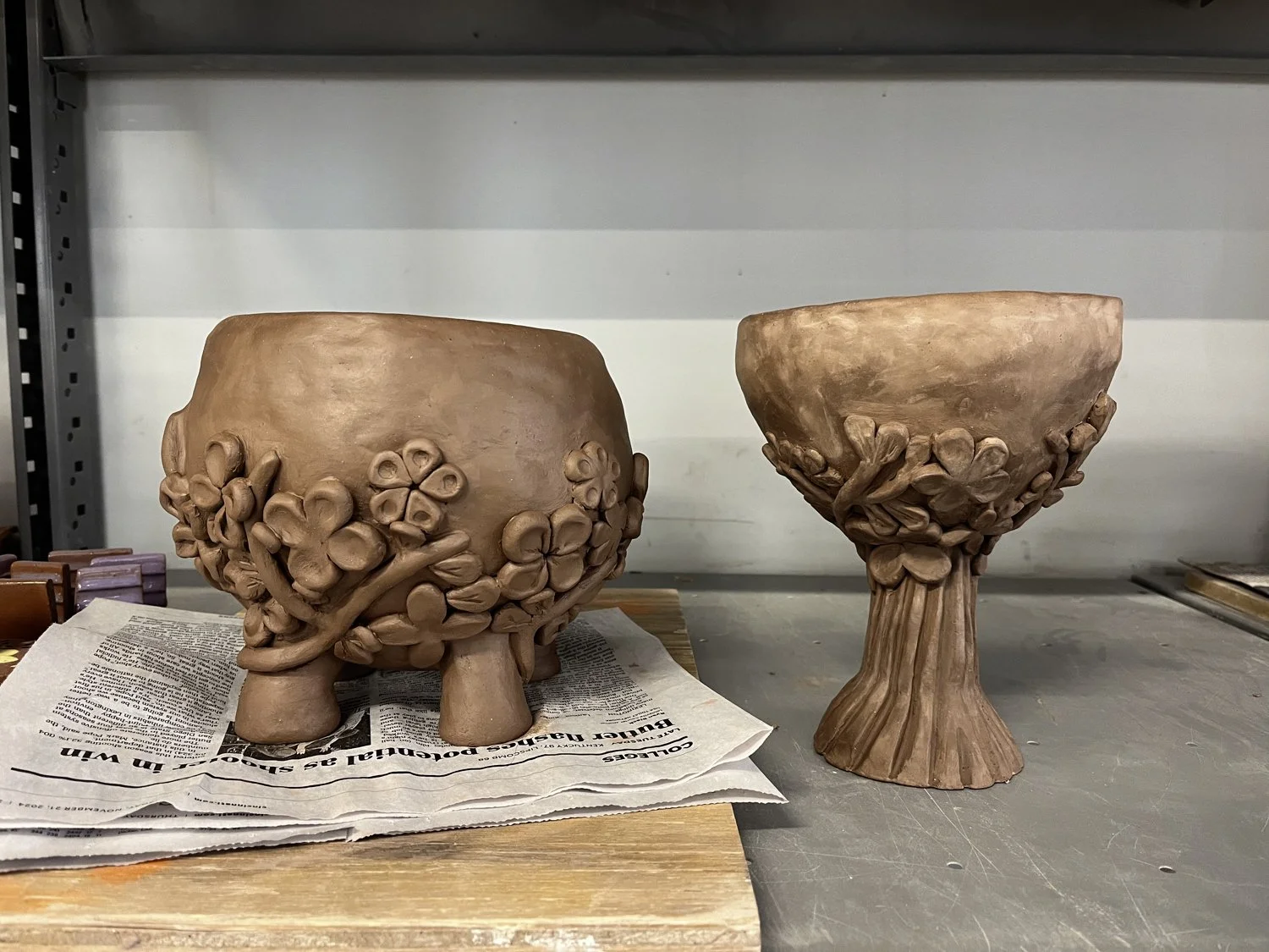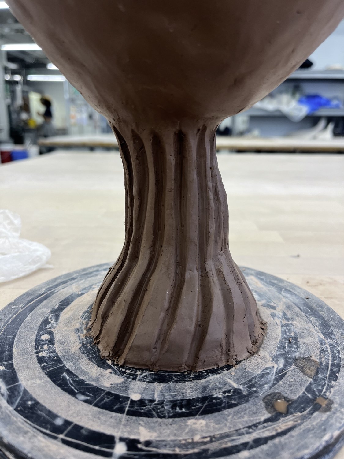 The chalice was also made with coils and then flipped to add the stem of the chalice. It was then carved to be a simple representation of flower stems.