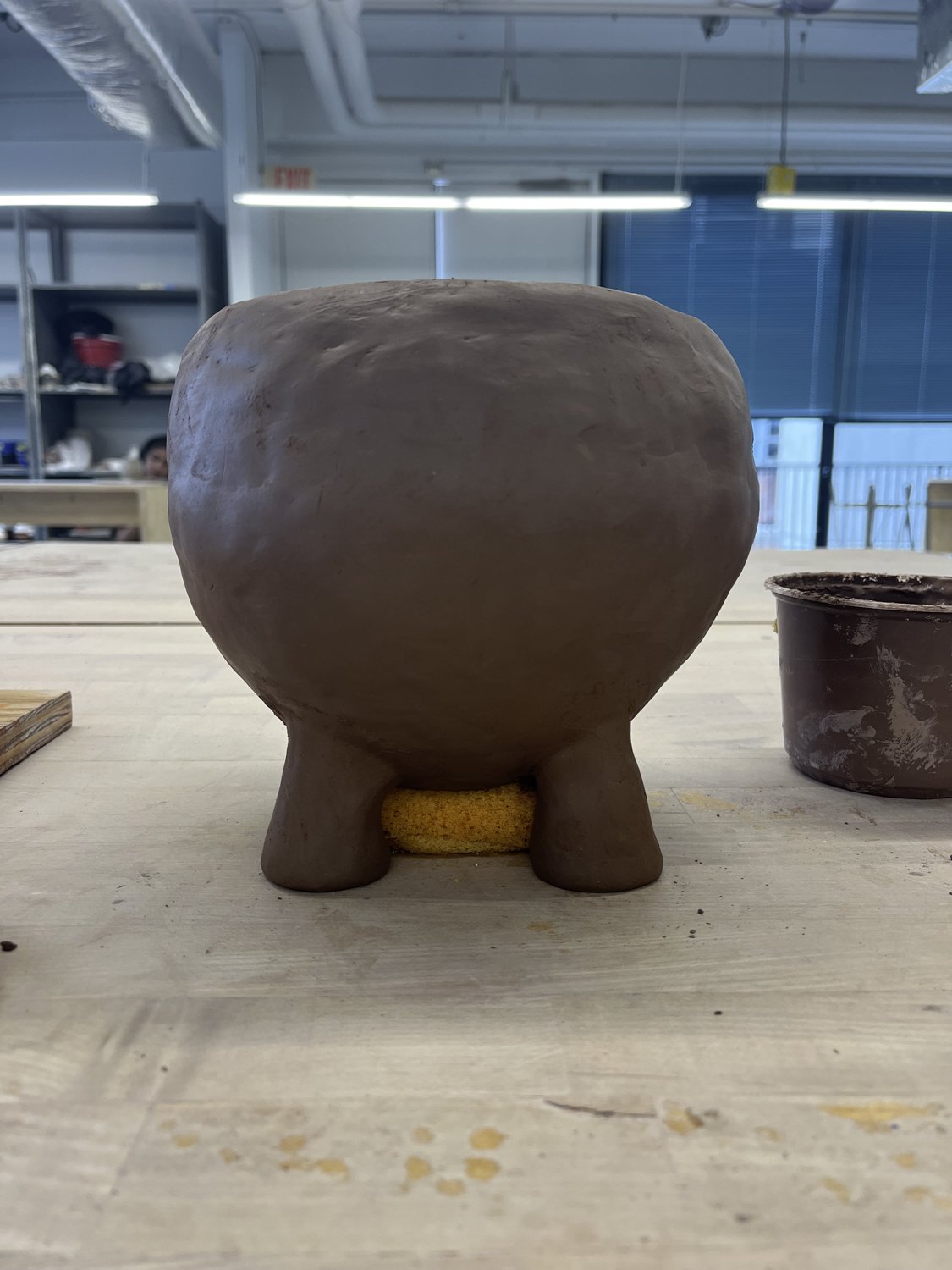I constructed the tripod by using a coiling method. I made it upside down so that I made a dome shape. I then flipped it over so and placed sponges underneath so that I could attach legs underneath. I accidentally made four legs instead of three. It is now a quadpod.